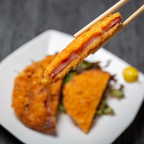 思わず懐かしさで笑みがこぼれる!?初めて食べる若者も目から鱗の美味しさ!ファンの多い当店のハムカツ。何万枚と作ってきたからわかる手先の感覚で、ロースハムに絶妙に粉付けを施します!経験に裏付けられた黄金比のハムカツを食べられるのは当店だけ!!昭和の庶民の味をぜひお試しください♪